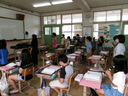 「ゆかいなもっきん」では、2拍子のはくを感じながら歩いたり手拍子をしたりしながら歌っています。今日はリコーダーのパートを入れてみんなで合わせてみました。「楽しい」「ゆかいな」「にぎやかな」感じが出せるように人数のバランスを考えて演奏しています。