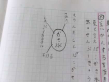 夏といえば・・・かき氷、夏祭り、すいか、ゆかた・・・たくさん思い浮かんだ言葉の中からひとつを選び、詳しくイメージしてから五・七・五にしてみました。