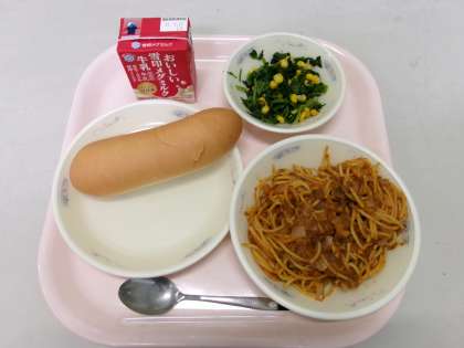 今日の給食は、小型コッペパン・スパゲティのミートソース煮・ほうれん草のソテーでした。スパゲティのミートソース煮には、ズッキーニが入っていて、子どもたちもたくさん食べていました。