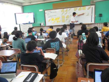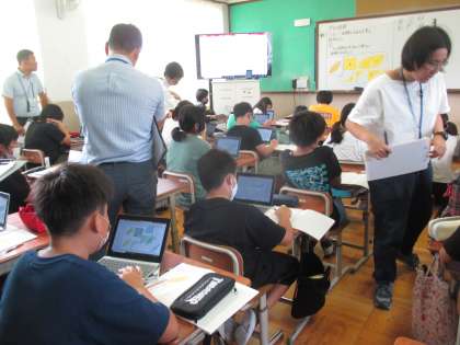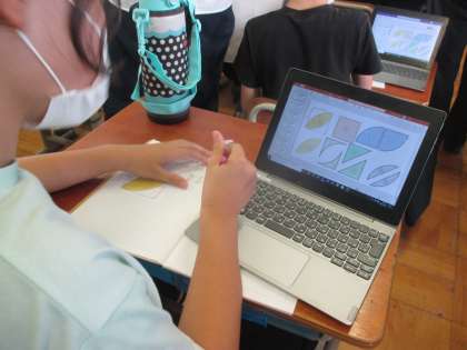 ラグビーボールのような形の面積をどうしたら求められるのか・・・・図形を見てそこに隠された形を手掛かりに面積を求めます。タブレットに送られてきた図形を実際に動かしながら一人学びが進んでいきました。「正方形から、扇形をひく。」「ひいた図形を2倍する。」など求め方を交流し、既習事項を使えば面積が求められることがわかりました。みんな抜群の集中力で素晴らしかったです!