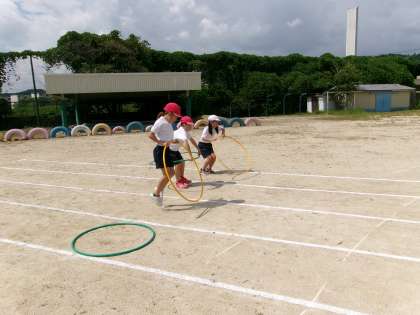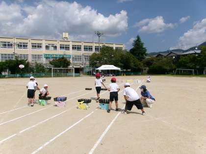 運動場で初めての練習でしたが、みんな張り切って跳んだり、運んだりしていました。