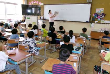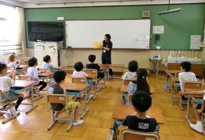1年生の教室では子どもたちが先生のお話に静かに耳を傾けて聞いていました。