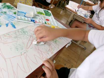 海の場面、草原の場面など思い思いの色をイメージして下描きのコンテの上から色をつけていきました。