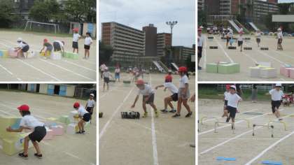 今日は、1・2・3年生で障害物走の練習をしました。跳んだり、ボールを運んだり、絵合わせパズルをしたりしてゴールを目指します。みんな本番と同じ気持ちで、全力で取り組んでいました。