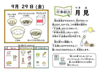 今日の給食は、お月見の行事献立でした。行事献立は、日本の伝統行事や料理、旬の食材を知る貴重な機会になっています。