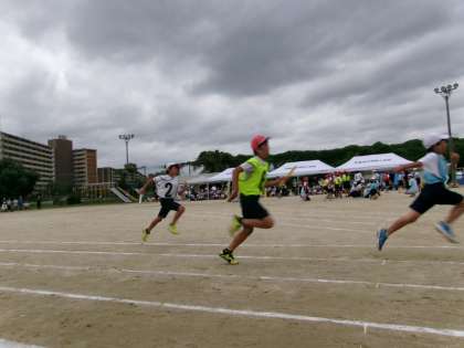 高学年の仲間入りをしてのリレー。ドキドキしながらバトンをつなぎました。力強い走りとスムーズなバトンパス、さすが高学年!迫力ある闘いで応援席からも「行けー!」「がんばれー!」と声があがっていました。
