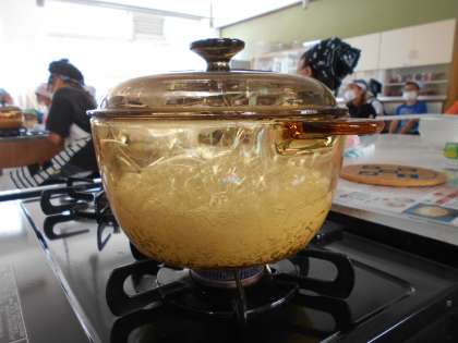 今日、家庭科では、ご飯を炊く調理実習をしました。