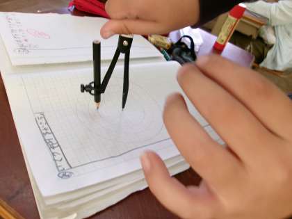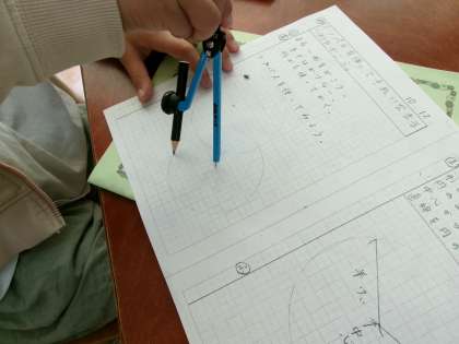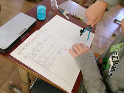 初めてコンパスを使って円を描きました。慣れるまでは力加減が難しく途中で線がずれてしまう人もたくさんいましたが、徐々に慣れてくるっときれいな円を描けるようになってきました。円を描けるようになったら、中心や半径、直径などの学習を進めます。