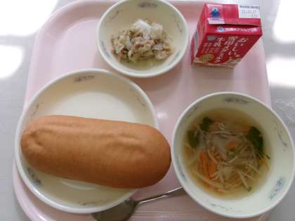 今日の給食は、コッペパン・ツナサンドの具・スープでした。子どもたちは、自分でパンに切り込みをいれて、上手に具を挟めるように工夫していました。残食もなく、みんなたくさん食べていました。
