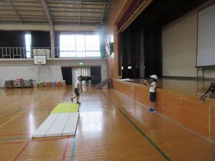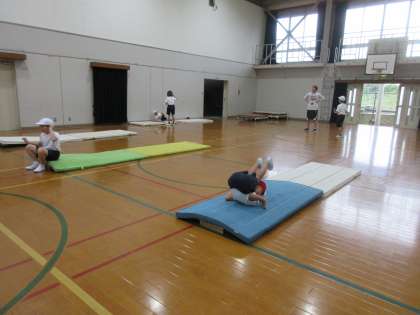 マット運動では、いろいろな技に挑戦しています。タブレットで動画を撮って足が伸びているのか確認したり、友だちからアドバイスをもらったりして技の完成度を高めることができていました。