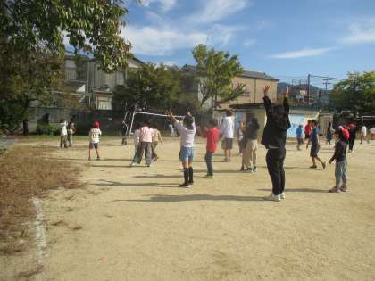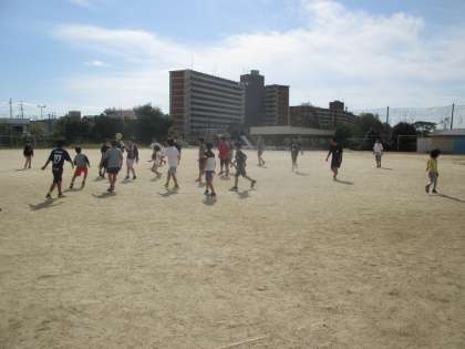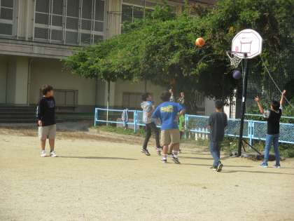 昼休みの運動場の様子です。たくさんの子どもたちがボール遊びを楽しんでいました。校長先生や担任の先生、ALTのAJ先生など、いろんな先生が一緒に遊びながら、子どもたちを見守っています。