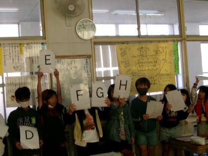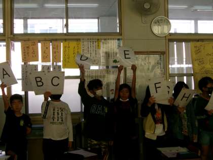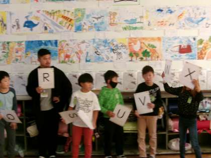 アルファベットの学習も後半になりました。A〜Zの26枚のカードをランダムに配り、一人1枚もしくは2枚持ち黙って順に並ぶゲームをしました。自分のカードがどこに入るのか、何の次なのか、ドキドキしながら並んでいきます。完成後は順に声に出しての確認です。ALTのAJ先生にも入っていただきました。1回目は3分ほどかかっていたのが2回目(カードは配り直しています)はなんと45秒ほどで完成しました。アルファベットは大半を覚えたと言っている人が増えています。