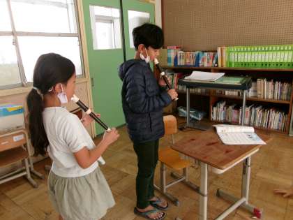 3年生も2重奏ができるようになってきました。「あの雲のように」を2パートに分かれてグループで演奏します。同じリズムではあるものの、互いの音につられそうになりながら何度も合わせているうちにきれいな2重奏ができるようになってきました。互いの音を聴く「耳」を育てられたら・・・と思います。