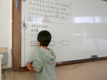 〇は□の何倍かをもとめる文章問題で、関係図をかく練習をしています。→を使って2つまたは3つの数字の関係を簡単に表し、わかならい数字を求めます。問題文をしっかり読み、図に入る数を正しく書き入れると後はスラスラ問題が解けます。今後の学習にもつながる大切な学習です。