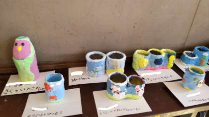 昨日から取り組んでいた制作が終わり、作品が完成しました。色にこだわった人、形にこだわった人、またいくつかの容器を組み合わせて作った人もいました。みんなの作品を学習室に飾っています。早く持って帰りたいという声も聞かれました。