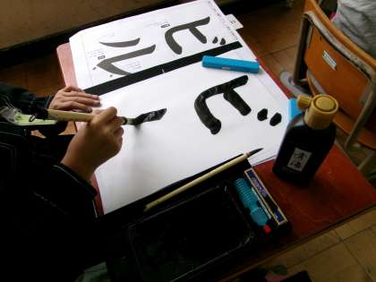 今日は曲がりと折れの入った「ビル」というかたかなを書きました。曲がりは筆を止めずに、折れは一度筆をとめてから、というポイントを部分練習したあと、集中して書きました。筆できれいに文字が書けるようになった人が増えました。
