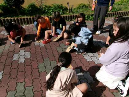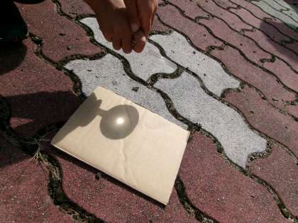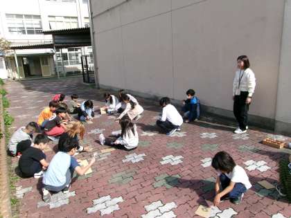 今日の学習問題は「虫めがねで日光を集めると明るさやあたたかさはどのようになるだろう」でした。外へ出て実験をすることが大好きな子どもたち。最初は曇っていた空でしたが太陽が出て、虫めがねで日光を集めることができました。虫めがねを少しずつ離し、段ボールに日光を集めると・・・焦げ臭い匂いがしたり煙が出てきたりしました。子どもたちは「うわぁー」「どうやったら出るん?」と一生懸命活動していました。少し間違えると危険を伴う実験なので、安全に行えるようしっかりとルールを守って学習することができました。