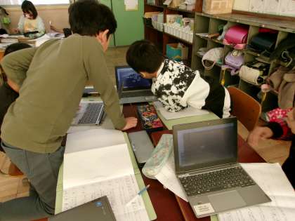 学習発表会に向けての準備を進めています。グループで話し合って決めたシナリオに合うようにスライドを作成したいという意見があり、今日はそのための写真をグループで協力して撮影しに行きました。グループの代表の人が写真を集約してみんなで順番に並べたり、説明を入れたりして仕上げていきます。