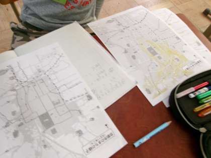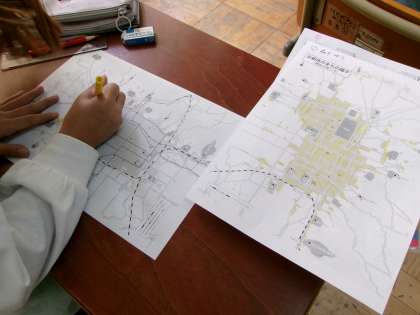 昔の京都市の様子を調べました。明治、大正、令和、一人3枚の地図に市街地や公共施設の印を書き込みながらどのようにかわってきたかを学習していきます。