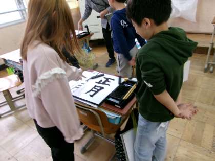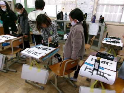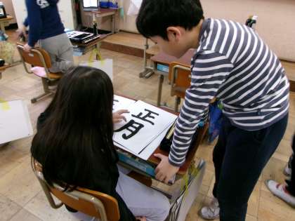 今日は書初めの練習をしました。「正月」にはこれまで学習した縦画、横画、折れ、曲がり、はね、などが全部入っています。筆を持つ前に思い出しながらそれぞれのポイントを確かめました。書いた文字を今日は友だちと見せ合ってアドバイスし合いました。レベルアップにつながりますね。