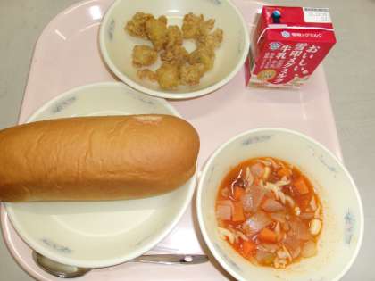 今日の給食は、牛乳・味付けコッペパン・スパイシーチキン(ヨーグルト入り)・ミネストローネでした。子どもたちは、スパイシーチキンをとても楽しみにしており、カレー風味のチキンを嬉しそうに食べていました。
