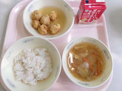 今日の給食は、牛乳・麦ごはん・がんもどきのあんかけ・豚汁でした。がんもどきは、調理員さんが一つ一つ丸めてくださいました。子どもたちは教室であんをかけて、からめながら食べていました。