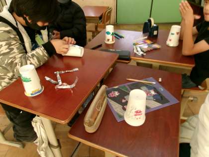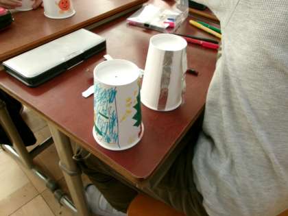 電気の通りみちの学習のまとめに、回路をつくって豆電球を光らす仕組みをおもちゃに取り入れた工作をしています。紙コップを2つ重ねて押さえたら明かりがつくもの、導線を穴に差し込んだら明かりがつくものの2タイプの仕組みで子どもたちは紙コップを自由に飾りつけし、オリジナルのおもちゃを作っています。とても楽しそうに、友だちと見せ合ったり話し合ったりしながら取り組んでいます。