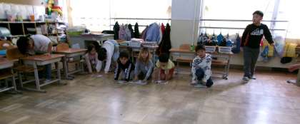 1年生の教室では、机を運び、ほうきで掃いた後は、ぞうきんを持って一列に並び、「用意スタート」で床をきれいに拭いています。みんなの元気で教室はピカピカです。いつもご苦労様。