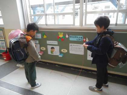 保健室前の掲示を見て、咳やくしゃみをしたときに飛ぶウイルスの