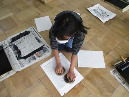 初めての彫刻刀で、不安もありつつ、細かいところに気を付けて彫っていました。