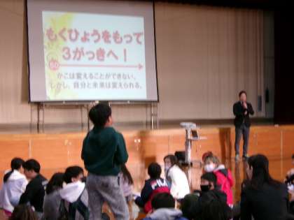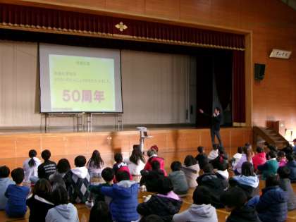 校長先生からは、池田小学校の50年間のあゆみについてのお話をしていただきました。そして各学年数名の児童が、3学期こんなことを目標にがんばりますと堂々と発表することができました。
