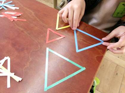 教科書についている4色の色棒を使って自由に三角形を作ってみました。そして、できたいろいろな三角形を仲間分けしました。3つとも同じ色棒でできたもの、2色と1色でできたもの、すべて違う色で作ったものに分けることができました。