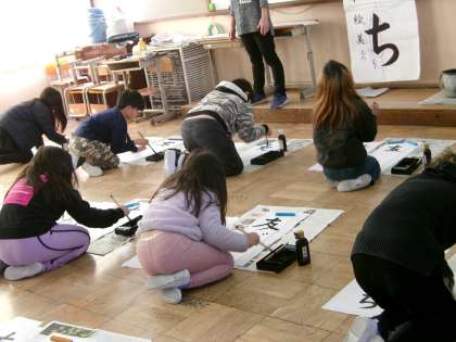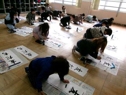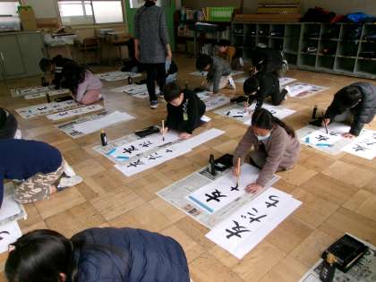 初めて画仙紙に字を書きました。これまでに学習したことがいろいろ入っている「友だち」という字を書きましたが、長い画仙紙にバランスよく書くのはとても難しかったです。お手本を見ながら一文字一文字慎重に取り組むことができました。