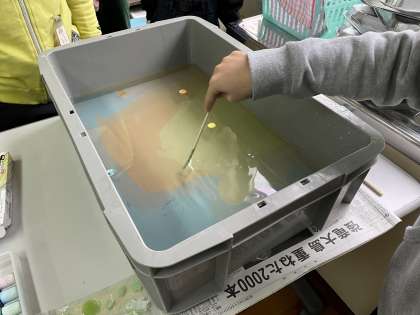 水の中できれいに模様ができていく様子や、和紙が染まる様子に、