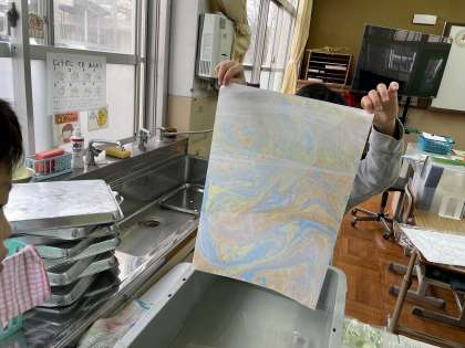 今日は、和紙をマーブリングで染めました。