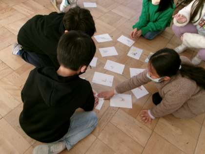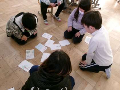 同じ漢字でも音読みと訓読みがあり、使い方が様々であることを学習しました。ひとつの漢字で音読み、訓読みのどちらもを使い、リズムのよい歌を考えました。それを読み札、絵札にし、かるたを作りました。グループで協力して完成し、今日はもう遊べたグループもありました。