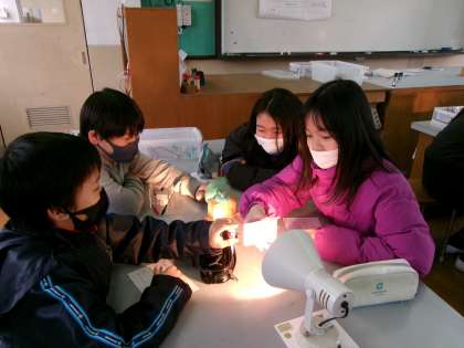 6年生の理科では、電気について学習しています。手回し発電機や光電池で作った電気やコンデンサーでためた電気が乾電池と同じ働きをするのか実験をして調べました。手回し発電機の回す速さで、豆電球の明るさが変わる様子に驚きの声を上げていました。優しく声をかけながら、協力して実験していました。