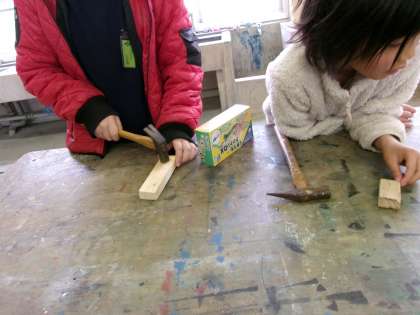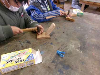 くぎ打ちトントンの学習で、木材にくぎを打つ練習をしました。初めて金槌を持った人も多く、イメージしているより難しかったという声が多く聞かれました。まっすぐにくぎが入らなかったり、途中で曲がってしまったり、打っても打っても入らなかったり、まだまだ練習が必要だなと感じましたが、楽しかった!面白い、またやりたい!と意欲満々の子どもたちでした。