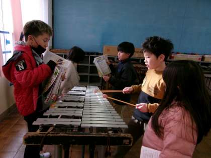 まずは鉄琴パートの旋律を口ずさみ、グループで少しずつ交代で練習してみました。演奏しない人は一緒に旋律を歌いながら進めています。よい音をリズムよく響かせられるように練習していきます。