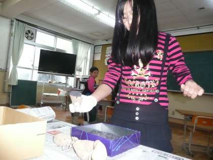 次に、ジャガイモの切口に草木灰を付けました。