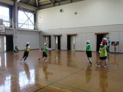 初めてのエンドボールをしました。前の学習のポートボールで学習したことを生かして、パスの仕方やデフェンスの動きを工夫し取り組むことができていました。