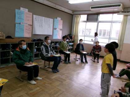 手作りのプレゼントを手渡しました。メッセージカードを嬉しそうに読んでくださっている姿を見て子どもたちも喜んでいました。その後、地域の方々お一人ずつにお話いただきました。「とっても嬉しいです。」「楽しかったです。」「これからもしっかり挨拶してくださいね。」と言っていただき、地域の方々との距離が縮まったと感じているようでした。