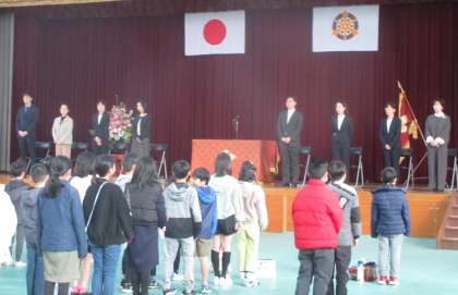 お世話になった先生方とお別れをする離任式が行われました。今年は8名の先生方が退任・離任されます。先生方のご挨拶の後、代表児童からお別れの言葉とPTAからいただいた花束の贈呈がありました。お世話になった先生方、今までありがとうございました。