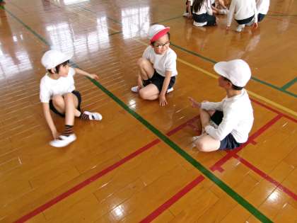 今日の体育は3・4年合同で体ほぐし運動をしました。中学年のオリエンテーションとして猛獣狩りをして、心も体も打ち解けることができました。