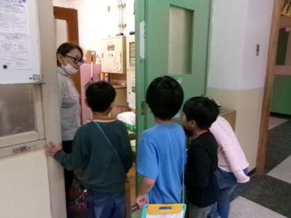 今日は1年生との学校たんけん当日。朝からドキドキしていた2年生。やる気は十分です。3〜4名ずつのグループになり、広い学校内を順に回ります。自分たちが作った看板を丁寧に読んであげてそれぞれの部屋の説明をしていました。職員室や用務室、事務室、保健室、校長室では直接職員とお話をすることもでき、特別に中にも入らせてもらいました。