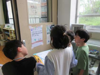 学校探検を終えて今日はみつけたお気に入りのものの絵を描きました。絵を見せながら友だちに伝えてもらう予定です。