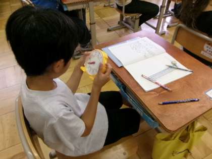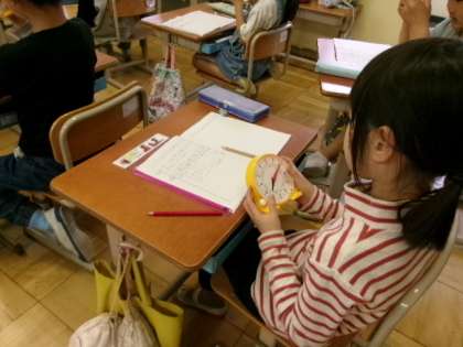 「時刻と時刻の間」を時間ということを知って、いろいろな時間を調べています。「8時に家を出て、8時30分に学校につきました。家から学校までの時間は?」じっさいに自分の時計を動かして、長い針がどれだけ動いたかを確かめます。また、今日は長い針が一回りしたら1時間、1時間は60分ということも学びました。生活の中で使う時計はデジタルのものが多いのかもしれませんが、時刻と時間の概念をしっかりと持ち、正しく使えるようにしたいものです。