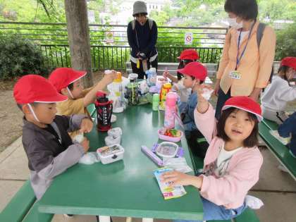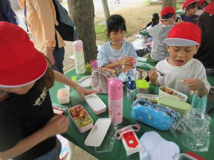 待ちに待ったお弁当の時間になりました。大好きなおかずやデザートなどが入っており、みんな喜んで食べていました。お弁当の準備ありがとうございました。