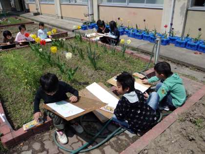 花壇にきれいに咲いたチューリップの絵を描きました。花壇の横には2年生が育てているチューリップもきれいに咲いていました。