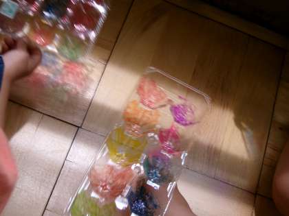 色がぬれたら、太陽の光を利用して地面や床に映し出してみました。残念ながら少し曇り気味だったので、映り方が弱かったのですが、透明なものが光を通して鮮やかになったことに驚いたり、友だち同士で見せ合ったりしながらいろいろな見え方を楽しみました。お天気のよい日にもう一度、映して楽しみたいと思います。